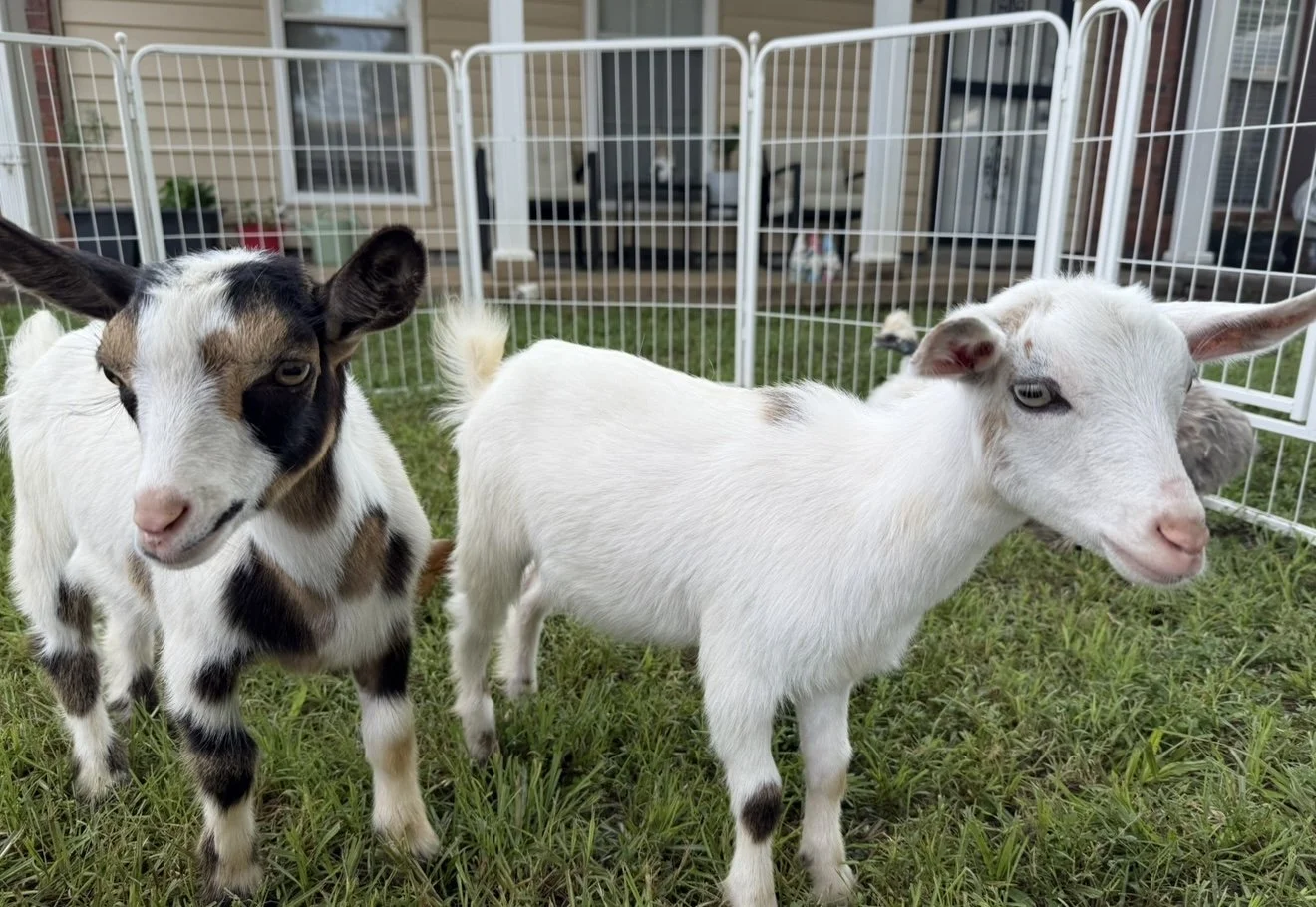 Our goats are the life of the party! Silly, playful, and always curious, they love nibbling snacks, hopping around, and making new friends. Whether they’re showing off their climbing skills or leaning in for a scratch, these goofy little farm clowns bring laughter and smiles wherever they go.